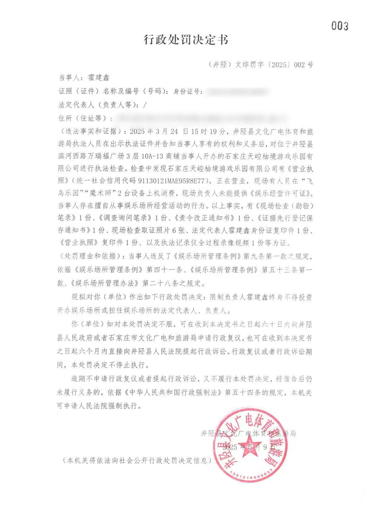 (井陉)文综罚字〔2025〕002号