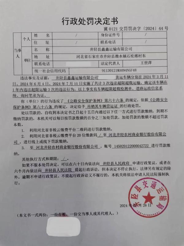 井陉县鑫鑫运输有限公司1年内违法超限运输3次的违法行为