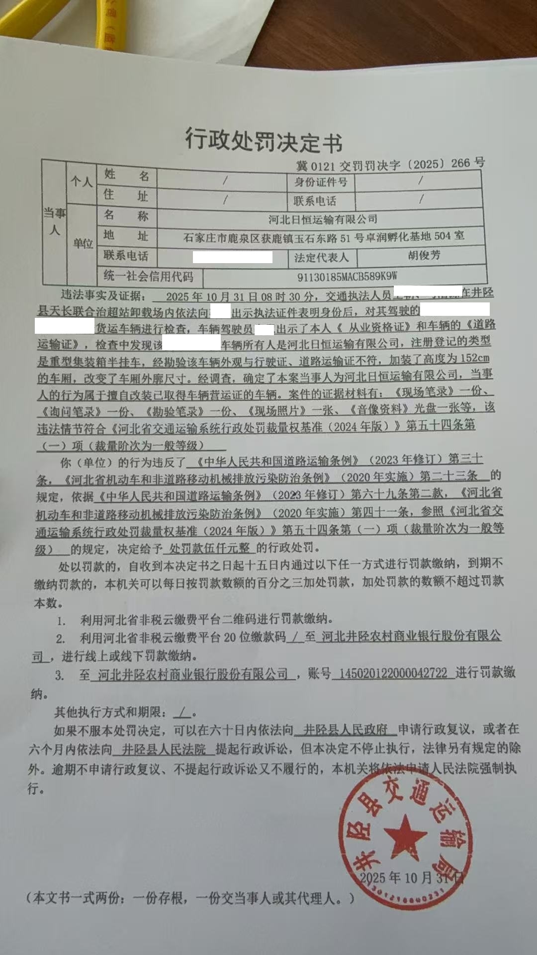 河北日恒运输有限公司擅自改装已取得道路运输证的车辆参加道路运输经营活动案