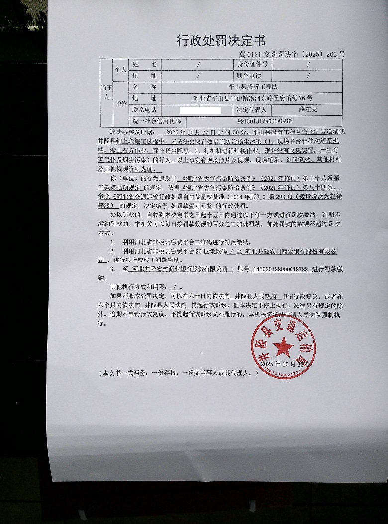 平山县隆辉工程队未依法采取有效措施防治扬尘污染