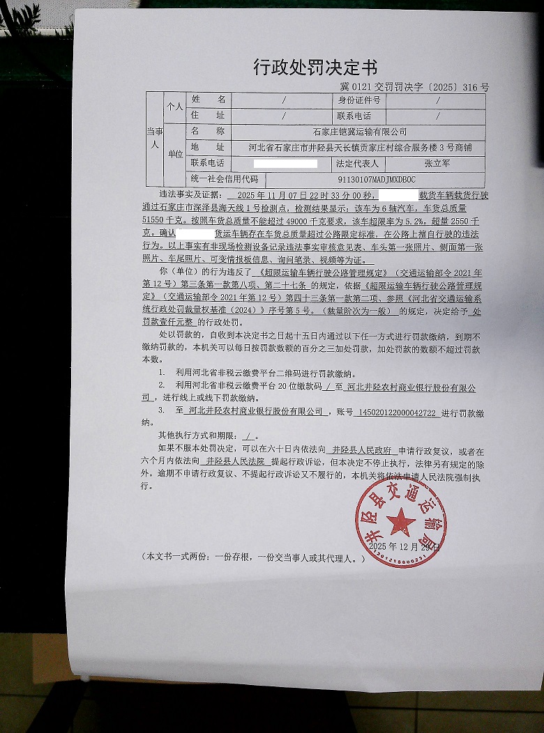 石家庄铠冀运输有限公司存在车货总质量超过公路限定标准,在公路上擅自行驶的违法行为