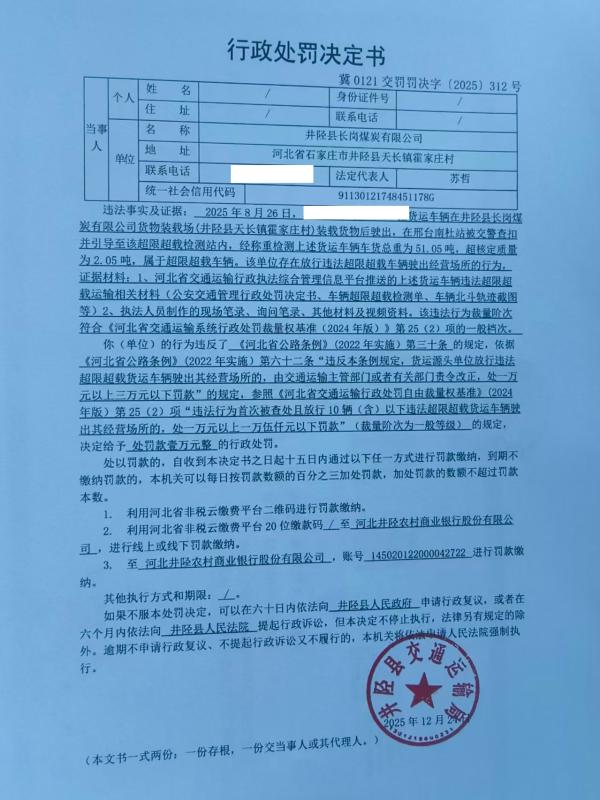 井陉县长岗煤炭有限公司未按规定装载货物,并放行超限超载车辆案