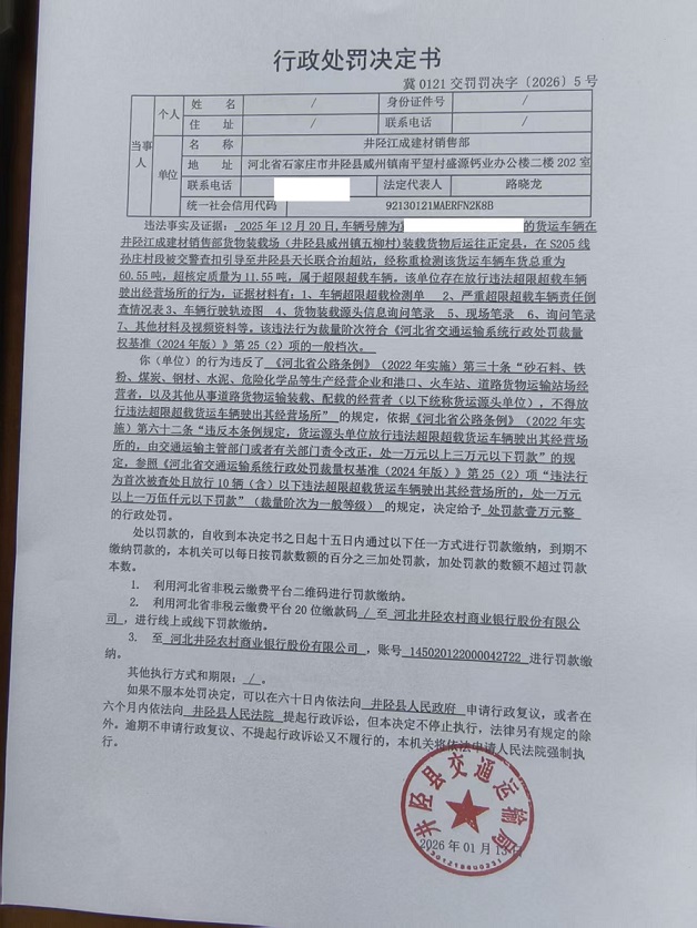 井陉县江成建材销售部放行违法超限超载货运车辆驶出其经营场所案