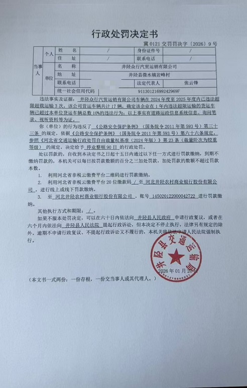 井陉众行汽贸运销有限公司在1年内违法超限运输的货运车辆已超过本单位货运车辆总数10%的违法行为