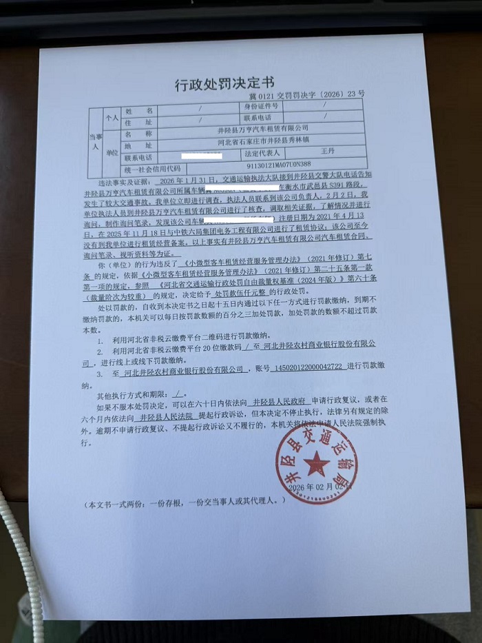 井陉县万亨汽车租赁有限公司未按照规定进行备案