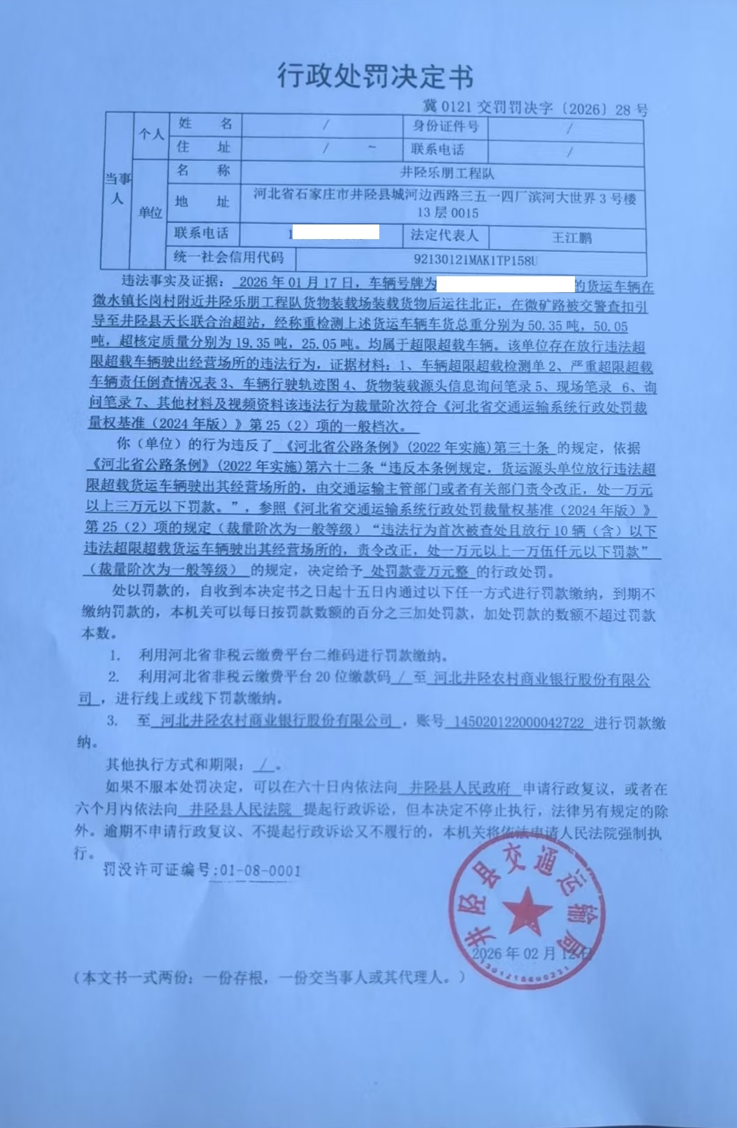 井陉乐朋工程队放行违法超限超载货运车辆驶出其经营场所案