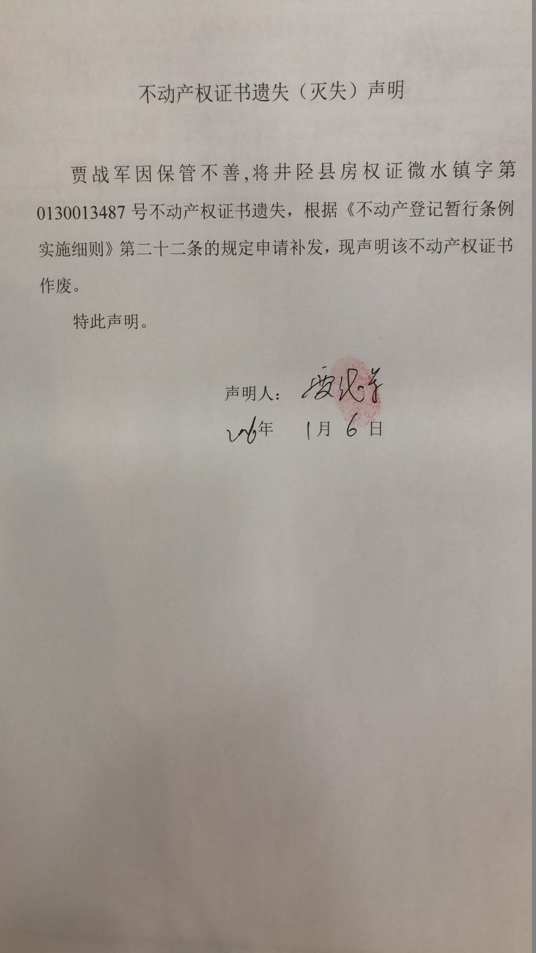 不动产权证书遗失(灭失)声明【微水镇字第0130013487号】