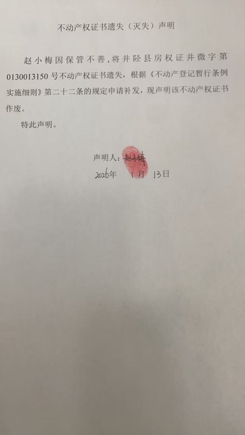 不动产权证书遗失(灭失)声明【井微字第0130013150号】