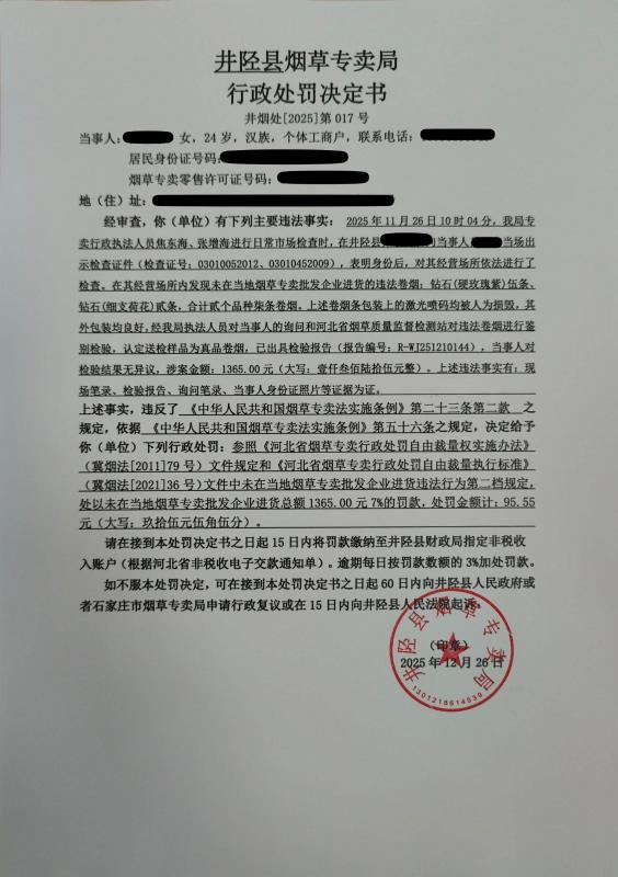 井陉县烟草专卖局行政处罚决定书(井烟处[2025]第017号)未在当地烟草专卖批发企业进货案