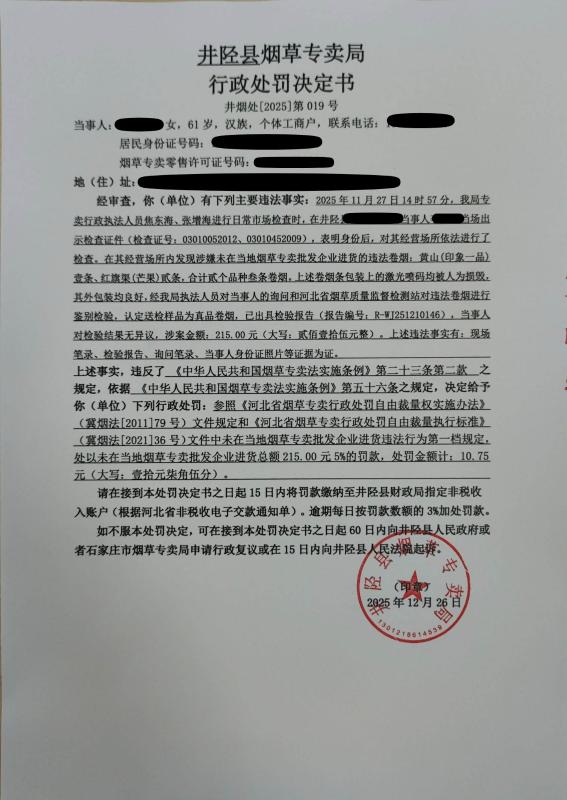 井陉县烟草专卖局行政处罚决定书(井烟处[2025]第019号)未在当地烟草专卖批发企业进货案