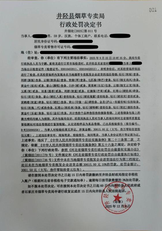 井陉县烟草专卖局行政处罚决定书(井烟处[2025]第011号)未在当地烟草专卖批发企业进货案