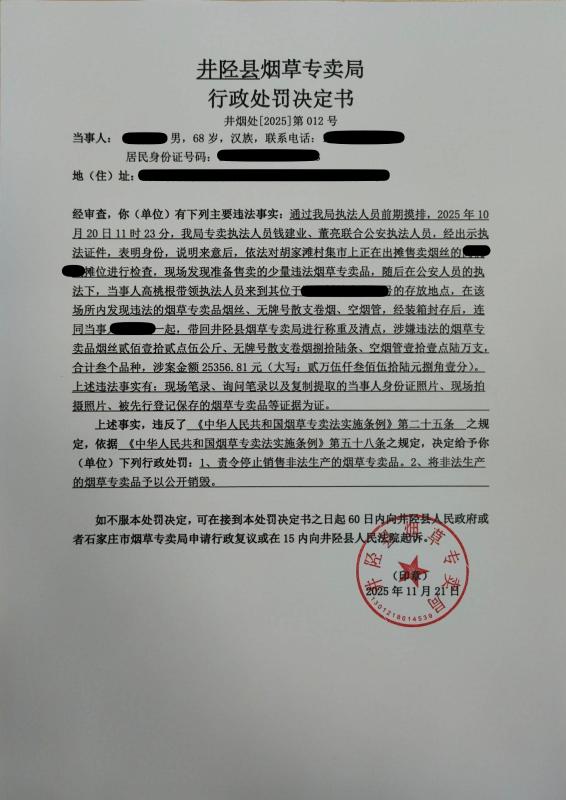 井陉县烟草专卖局行政处罚决定书(井烟处[2025]第012号)销售非法生产的烟草专卖品案