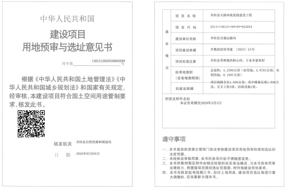 批后公布 井陉县天路西线复线建设工程项目用地预审与选址意见书 用字第1301212026XS0002699